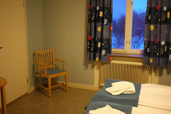 お勧めはレストランの手前にある階段を降りたところ。TVルームといって広いガランとした部屋があります。暗いし北向きで、外にも出れるので、この部屋を拠点にすれば安全にオーロラ鑑賞が楽しめます。